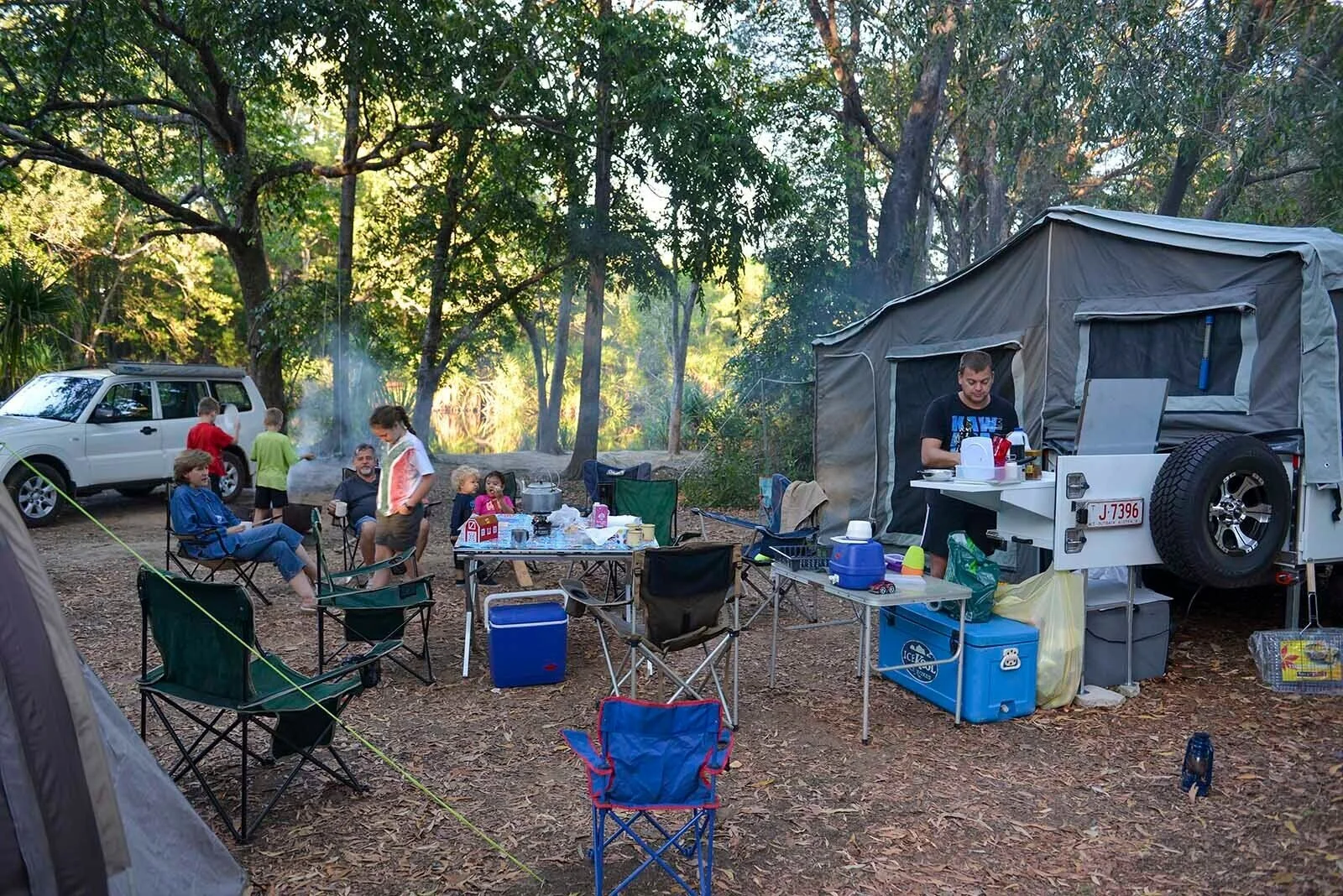 With Family and friends, we have camped on the banks of the Douglas River in the park and we had a great time. The amenities were kept clean and the staff was very helpful. We have had dinner in the restaurant and found it to be good quality pub-style food. The powered sites are quite close together and the park is easily filled up in the dry season especially over long weekends. Booking over these periods is essential.
