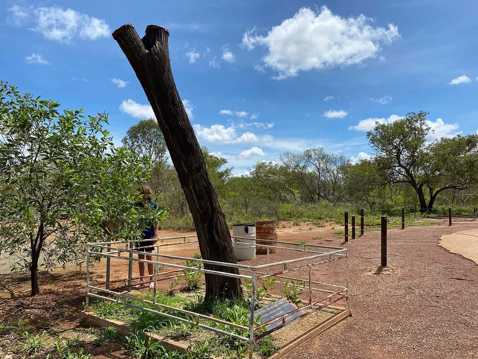 On the outskirts of Daly Waters town, a forlorn, dead tree trunk stands. The tree trunk is protected by an aging pipe fence, a concrete border on the ground, and a memorial plaque at its base. The presentation gives the impression of a lost cemetery with a solitary occupant. A fading information board next to the tree provides some insight into the cultural significance of the stump.