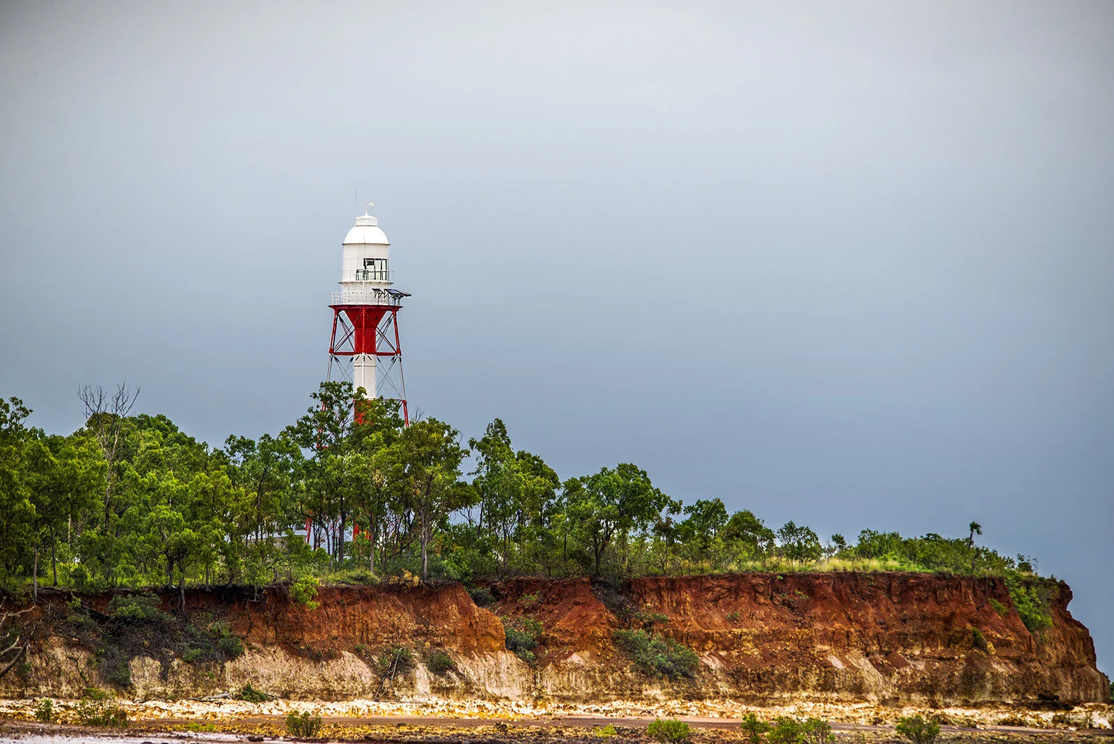 Point Charles Lighthouse was established in 1893 it is the oldest lighthouse in the NT. The structure was imported from Birmingham, England in sections and then erected. The 28m tower is constructed of wrought iron and consists of a 2m diameter central tube, with struts and braces. A spiral staircase inside leads to the lantern room on top of the gallery. Several iron lighthouse keepers’ cottages were constructed, with wooden floors and verandahs.