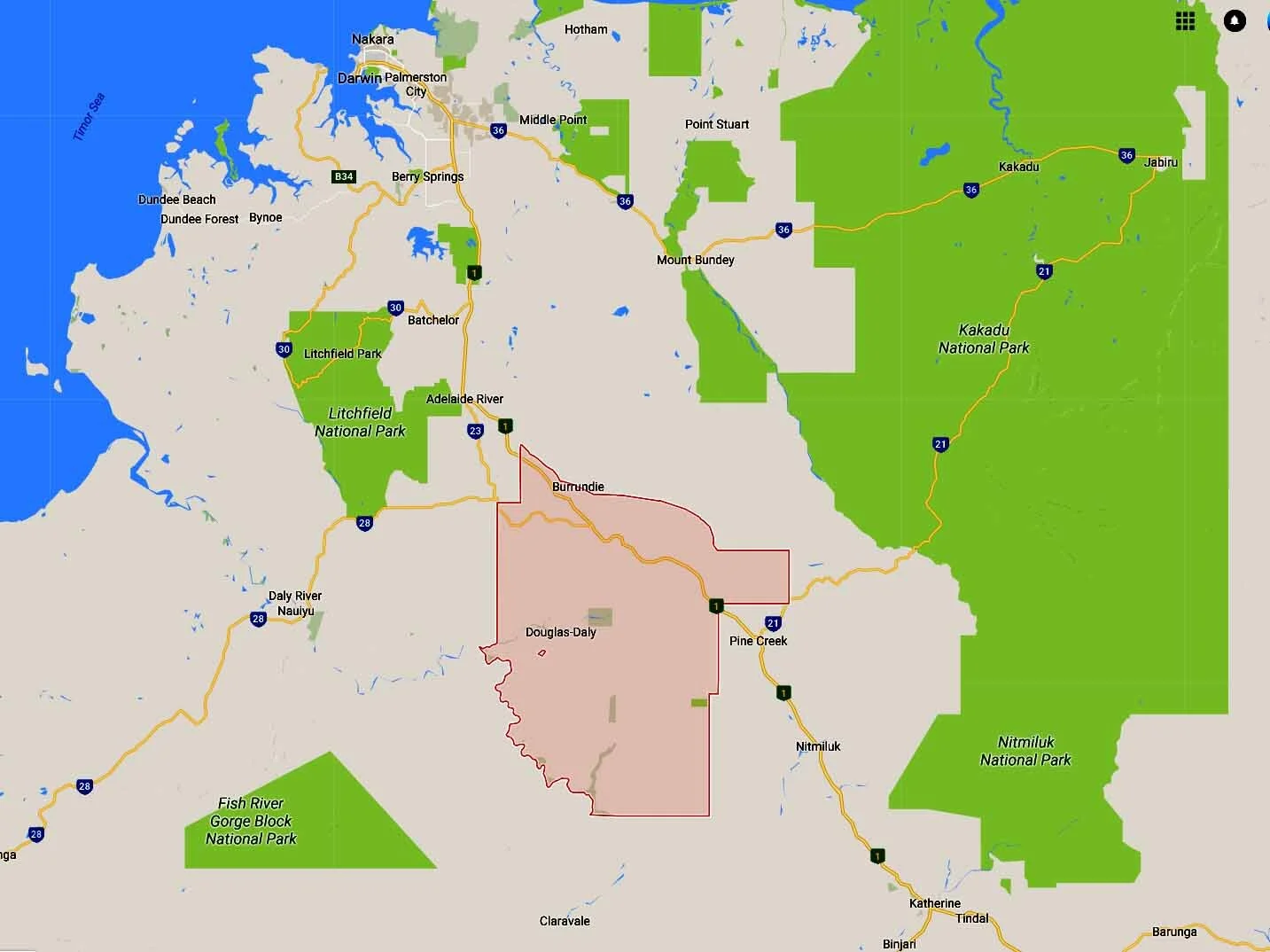 Make sure you are on the correct road and travelling to the Douglas Daly and not to the Daly River. The Douglas Daly and the Daly River are two separate areas only 200km south of Darwin that border on each other. Both areas are accessible via Dorat Road (sealed). Driving south on the Stuart Highway turn off (to the right) just north of Hayes Creek onto Dorat Road; after 5.2km turn off onto Oolloo Road towards the Douglas Daly Experimental Station this will lead to Douglas Daly. Some of the attractions in the Douglas Daly area are accessed via the Stuart Highway.
